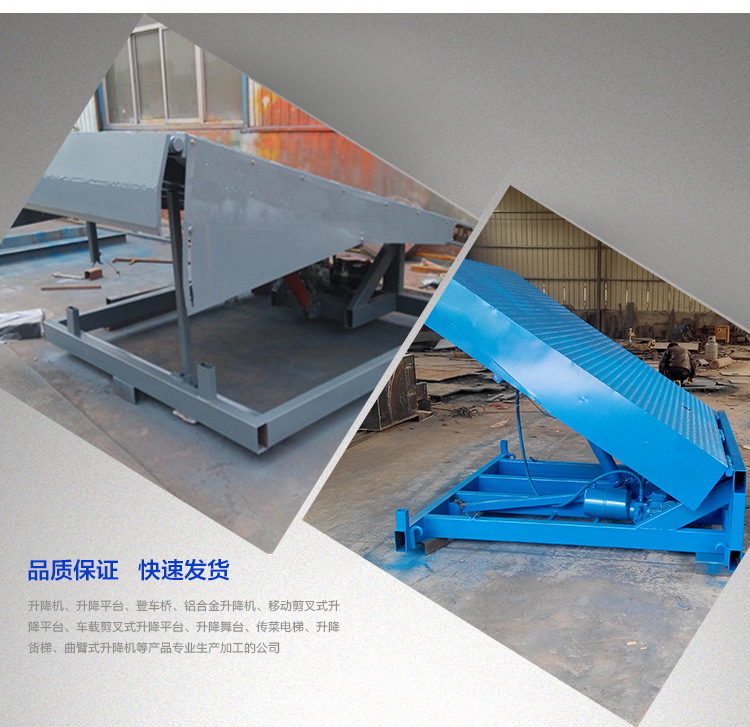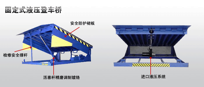 Fixed hydraulic boarding bridge, also known as platform height adjustment plate, is widely used in storage and logistics bases with frequent loading and unloading of goods, such as warehouses, stations, docks, postal transportation, logistics distribution and other places. This device is integrated with the platform and serves as a bridge between the warehouse and vehicles, assisting in the loading and unloading of goods by vehicles or other transportation equipment. When in use, the height can be adjusted according to the height of the truck compartment. Forklifts or other transportation equipment can enter the interior of the compartment through the bridge deck for operation, saving time and effort, greatly improving work efficiency.
