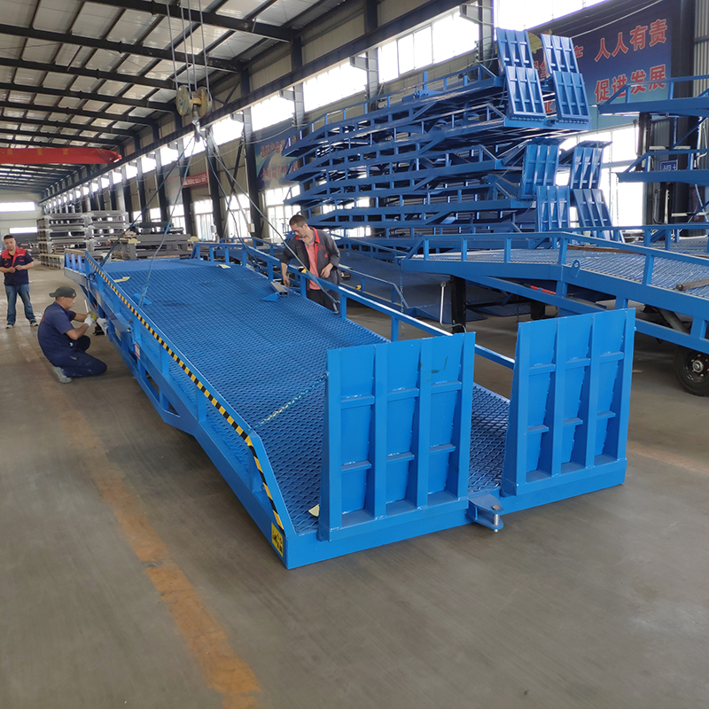 Mobile boarding bridge is a specialized auxiliary equipment for cargo loading and unloading, used in conjunction with forklifts, for places where there is no loading and unloading platform on site or where mobile cargo loading is required. It is equivalent to a mobile steel structure slope, and forklifts can also directly enter the truck compartment for batch loading and unloading operations. The product adopts manual hydraulic power and does not require a power supply. Only single person operation is needed to achieve safe and fast loading and unloading of goods.